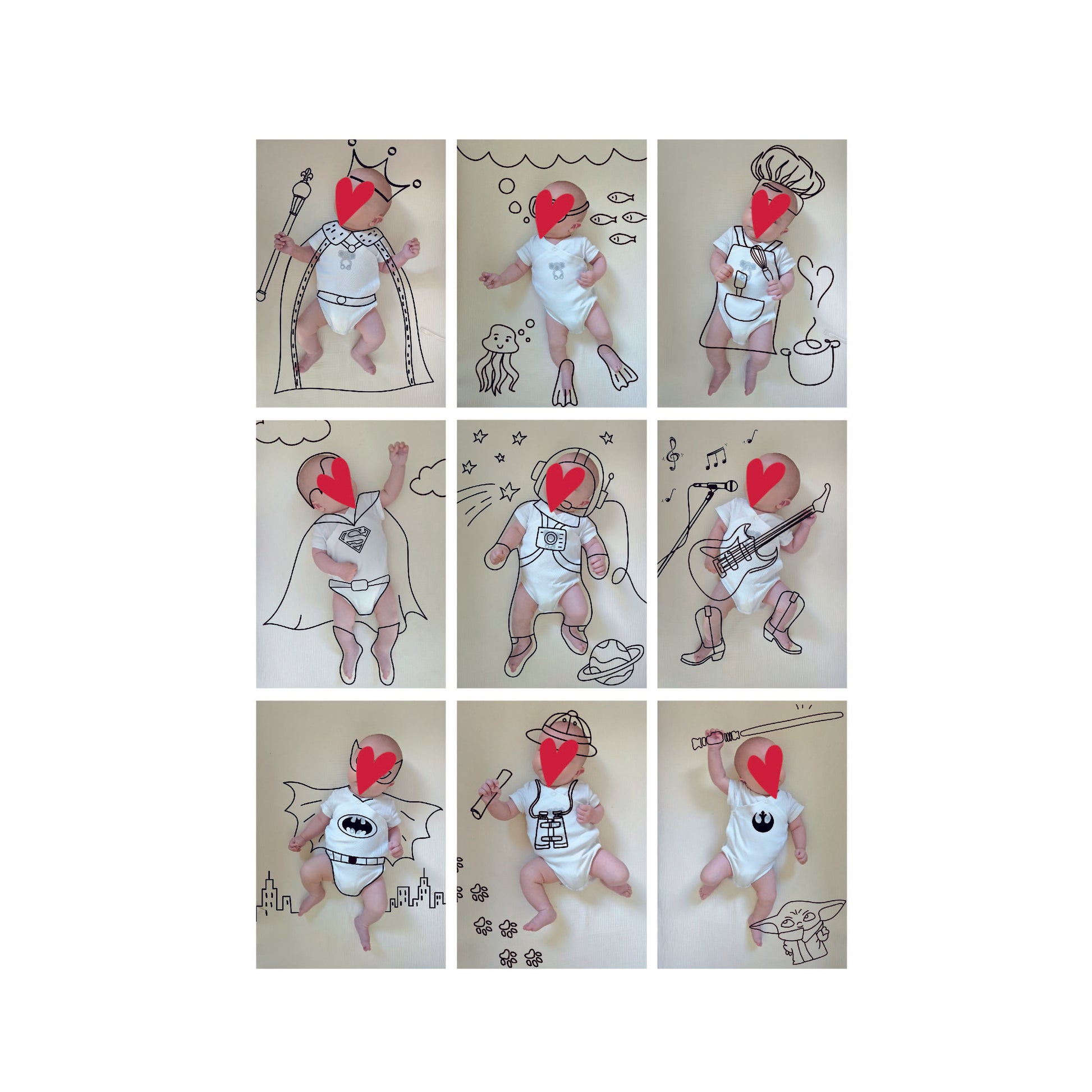 Amho transforme vos photos de naissance en petites histoires. Une simple image devient un univers : votre bébé nage au milieu des poissons, prépare un gateau géant ou enfile la cape de Superman !